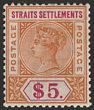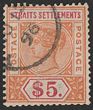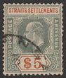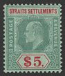 1902-03 KEVII $5 dull green & brown-orange, wmk crown CA. Postally VFU with Singapore cds, nice colours. Scott 104 cat US$180, SG 121 cat £225. Quite rare postally used as vast majority are F/C. (P)