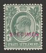 1904-10 KEVII 1c deep green, wmk mult crown, h/s SPECIMEN sans-serif RED opt type D9 (15x2mm). VF fresh MLH. SG 127s. From DLR archives & probably unique! Certificate for any of these specimen opt rarities can be obtained on request. (P)