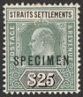 1904-10 KEVII $25 grey-green & black, wmk mult crown, opt SPECIMEN. Superb fresh MUH, pristine never hinged original gum. SG 139s cat £500 for M, should be at least double, £1000 MUH (normal cat £3500 M, £7000 MUH). (P)