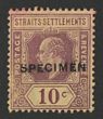 1906-12 KEVII 10c purple on yellow wmk mult crown, h/s SPECIMEN sans-serif black opt type D9 (15x2mm). F-VF UN, sl pink staining. SG 159(s)(var). From DLR archives & probably unique specimen! (P)