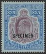 1906-12 KEVII $25 purple & blue/blue, opt SPECIMEN. VF fresh M, nice deep colour. SG 168s cat £800 (normal cat £3750). (P)