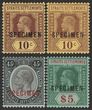 1912-23 KGV 10c purple on yellow -white back, 10c on lemon back, 45c on blue-green/olive back & $5 green & red/green, wmk mult crown, all opt SPECIMEN. VF fresh M/MLH. SG 202bs, 202cs, 208as, 212as cat £375. (4) (P)
