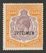 1906-12 KEVII $500 purple & orange, opt SPECIMEN, wmk mult crown. VF fresh MLH, bright colours. Scott 146(S) cat US$4500, SG 169s cat £5000 (normal cat £200,000). Only 409 distributed. Key British Empire top value. 2007 Ceremuga photo cert. (P)