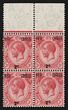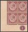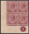 1921-33 KGV 6c dull claret, LL cnr marginal blk of 4 with plate no 1, wmk Mult Script. VF MUH. Scott 188. SG 227 cat £10 for M singles, should be at least double £20 MUH plus premium for plate blk.