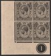 1921-33 KGV 1c black, LL cnr marginal blk of 4 with plate no 1, wmk Mult Script. VF MUH, tropical gum. Scott 179. SG 218.