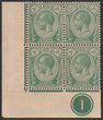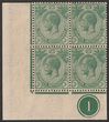 1921-33 KGV 2c green, LL cnr marginal blk of 4 with plate no 1, wmk Mult Script. Stamps VF 2 M/2 MUH. Scott 180. SG 219.