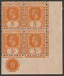 1921-33 KGV 5c orange Die I, LL cnr marginal blk of 4 with plate no 9, wmk script. Stamps VF MUH. SG 225 cat £24 for M, should be at least double, £48+ MUH, plus premium for plate blk.