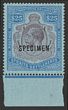 1921-33 KGV $25 purple & blue on blue, opt SPECIMEN, wmk script. Superb fresh MUH, bottom marginal. Scott 202 cat US$425 for M, SG 240bs cat £450 for M, should be at least double, £900 MUH (normal cat £1500 M). Rare so nice. (P)