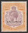 1912-23 KGV $500 purple & orange-brown, opt SPECIMEN, wmk mult crown, top value. VF fresh M, with beautiful bright colours. Scott 174(S) cat US$4750, SG 215s cat £5500 (normal cat £100,000). Key British Empire KGV top denomination. (P)