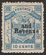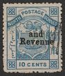 1886 'and Revenue' opt Arms 10c blue. Superb VFU, barred oval pmk, w/c. Scott 18 cat US$375. SG 15 cat £375. Rare. (P)