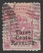 1886 'Three Cents Revenue' opt Arms 4c pink, Postal Fiscal. Postally U, barred pmk, tear at top but VF appearance. SG F1 cat £190 & under-catalogued. (P)