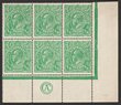 ½d Emerald Electro 2 CA Monogram imprint blk of 6. Stamps VF fresh MUH, with monogram part of selvedge also MUH. SG 20b(var). ACSC 63A(2)zb cat $1250 for M strip, should be at least double, $2500 MUH, plus 4 additional stamps, $2580. (6). (P) |