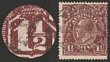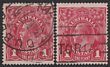 1d Scarlet Aniline & Deep scarlet aniline varieties rusted cliches (4/34 & 4/35), nice dated examples. G-FU, variable centring as usual. ACSC 71I(2)ja & 71ja, cat $1500. Ex Sandy. (2). (P) |