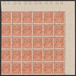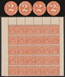 2d Orange Electro 9 (dull to pale semi surfaced paper), bottom right marginal blk of 30 plated as 9R 31-60. This is a companion piece to previous lots & has a part Harrison Imprint. It shows the major varieties 'white flaw on U', 9R 36 (ACSC 95G(9)i. F-VF MUH, even slightly darker gum. SG 62(var). ACSC 95G cat $11,350 MUH. A major exhibition piece. Ex Sandy. (30). |
