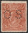 5d Intensely dark 'black-brown' perf 14, single wmk, perf OS. Superb VFU, Registered Melbourne 3/10/18 cds. SG O42c(var). ACSC 123Fb cat $20,000 & under-catalogued relative to other KGV material. Beautiful example of this major shade variety. 2012 Drury photo-cert. (P) |