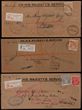 Covers: 1921-31 OHMS Registered Unclaimed covers with KGV perf OS 1½d red single wmk (ACSC 89Abb) & 3d blue single wmk (ACSC 104Bba) dated 20 JAN 26, 1½d red single wmk (ACSC 89Abb) & 3d blue SM wmk perf 14 (ACSC 106Aba) dated 23 MAR 28, 5d orange-brown SM wmk perf 13½x12½ (ACSC 126Ab) dated 24 AUG 31. From Perth, various transit b/s, Unknown To Letter Carrier, Not Known. etc. VF fresh. ACSC cat $375. (3)