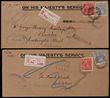 Covers: 1925-28 OHMS Registered Unclaimed covers with KGV perf OS 1½d red single wmk (ACSC 89Abb) & 3d blue single wmk (ACSC 105Bba) dated 10 DEC 25. Second cover perf OS 1½d red single wmk (ACSC 89Abb) & 3d blue s multi wmk perf 14 (ACSC 106Aba) dated 23 FEB 28. From Perth, various transit b/s, Unknown By letter Bearer etc. VF fresh. ACSC cat $225. (2)