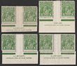 1d Green, plate 4, imprint prs (4) showing the progression of the variety 'RA join' (7/60) & the change of printers. Firstly Mullett pr with 'RA join' (Oct - Mar 1927), Mullett pr with 'RA retouch' (Mar-Sep 1927) both in translucent & normal paper, Ash took over as printer, Ash pr with 'RA retouch'. The original imprint with 'RA joined' is quite scarce. F-VF 3 MUH/1 MLH. SG 86(var). ACSC 80A(4)a cat $1000+ for imprint prs. (8) |