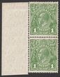 1d Green marginal pr 7/31 wattle line State II (thick under LVT) & 7/37 flaw under neck State III re-entry duplication of nose & below RVT with additional translucent paper variety. Scarce positional piece. Top stamp MLH uneven gum color, lower stamp MUH. SG 86(var), ACSC 80B(4)fa & hb cat $500, worth at least double for translucent paper = $1000. (2) (P) |