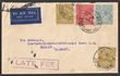1/4 Greenish-blue, tied by 'Late Fee Melbourne 19 MR 37' on commercial airmail Bank of Australia cover to Germany. The postage was initially 1/10 & a Late Fee of 4d was applied, few PO ink marks. Unusually it has a rare late usage KGV 1/4 greenish-blue SM wmk perf 14, which is mainly seen 1927/28, while other stamps 2d & 4d olive (2), are wmk CofA. ACSC 129A cat $2500+. Extremely rare usage & franking. (P) |