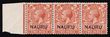 1916-23 'NAURU' opt KGV 2d orange Die I horiz marginal strip of 3 with error 'NAUP.U' on centre stamp, plus right stamp 'broken N'. VF fresh 2 MLH, main variety MUH. SG 4/4a/4d cat £455 for M singles, should be at least double, £900 MUH, plus premium for positional strip. Certificate can be obtained on request. (P)