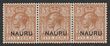 1916-23 'NAURU' opt KGV 5d yellow-brown, setenant horiz strip of 3, middle stamp variety 'NAUP.U' instead of 'NAURU' & right stamp with broken 'N' variety. VF fresh M. SG 9/9a/9d cat £2312+ as singles, & should be +50% for setenant variety multiple, so £3468. Extremely rare. 2007 BPA photo cert. (P)