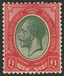 1913-24 KGV £1 green & red. F-VF fresh MLH. Scott 16 cat US$803. SG 17 cat £700. (P) |