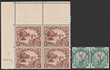 1930-44 Springbok ½d black & green, horiz bilingual pr, left stamp 'Dollar' variety plus Native Kraal 4d brown, UL cnr marginal blk of 4, LR stamp 'Monkey' in tree variety, both Rotogravure (Pretoria printing). Stamps VF fresh MUH. SG 42 & 46ca cat £118 for M, should be at least double £236 MUH (2 items). (P) |