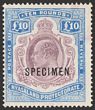 1908-11 KEVII £10 purple & ultramarine, opt SPECIMEN. F-VF fresh MLH. SG 82s cat £1100 (normal cat £13,000). Rare top value. Exp. (P)