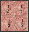 1881 Provisional Surch QV ½ on 1d dull red se-tenant blk of 4, with top 2 stamps opt SG Type 9 & bottom 2, SG Type 10. F-VF fresh M. Scott 10+11 cat US$560+ as singles. SG 17+18 cat £360+ as singles, plus premium se-tenant blk which should be +50% so est cat £540. (4) (P) |