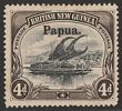 1906-07 small Papua opt on BNG on 4d black & sepia on wmk horiz thick paper. W/C VFU. Scott 15 cat US$160. SG 17 cat £180. (P)
