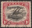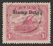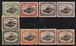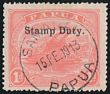1907-15 'Stamp Duty' opts^ Lakatoi group inc small Papua - 6d black & myrtle green (SG 53), ½d black & deep green SG 66a scarce shade, 1d black & carmine SG 67 Large Papua 1d black & carmine SG 76 1d rose pink SG 85 (3), 1d grey black & red (SG 946) with 'curved stamp duty' opt. GU-FU. SG(var) cat £200 as normal stamps, should be at least double for scarce opt £400. Stamp duty opt are scarce and are interesting segment of Lakatoi study. (8)