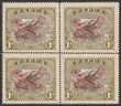 1930 Airmail plane opt 1/- sepia & olive, opt in deep carmine-lake (instead of normal carmine), Harrison printing on yellowish paper, blk of 4 with 1st stamp major variety 'AI,R' due to comma between I & R. VF 2MLH/2MUH. SG 117(var). Only small 1st part of printing was in deep lake with the variety present, which was then corrected for subsequent printings. Very rare variety that deserves to be listed in SG. RPSL photo cert. (4) (P)