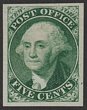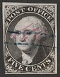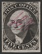 1845 New York Postmaster Provisional 5c black Washington, initialled ACM with A&C connected. VFU, 4 margins, blue pen cancel. Scott 9X1a cat US$525. SG 65 cat £500. Scarce classic. 2001 PF/NY photo-cert. (P) |