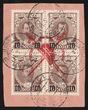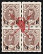 1917 Russian Revolution 'Crossed Swords & Cap' red opt Romanov 10/7k brown blk of 4. VFU, on piece. Scarce historical item! |