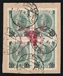 1917 Russian Revolution 'Crossed Swords & Cap' red opt Romanov 20/14k green blk of 4. VFU, on piece, '8-5-17' cds. Scarce historical item! |