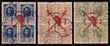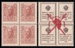 1917 Russian Revolution 'Crossed Swords & Cap' scarlet & red opts Romanov set 10k, 15k, & 20k, blks of 4 stamp currency printed on card. VFU 'Petrograd 3.5.17' cds. Scarce historical items! (3 blks). (P) |