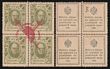 1917 Russian Revolution 'Crossed Swords & Cap' red opt Romanov 10k blue blk of 4 stamp currency printed/card. VFU. Scarce historical item! |