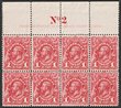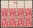 1913 KGV Engraved 1d carmine-red plate no 2 imprint blk of 8 (top of sheet). Superb fresh VF MUH. SG 17. ACSC 59C(2)z cat $375 M, should be at least double $750 MUH. Unusually fine for this issue. (8) (P) |