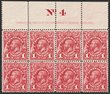 1913 KGV Engraved 1d carmine-red plate no 4 imprint blk of 8 (top of the sheet). Fresh VF MUH, 3 stamps light natural paper wrinkle. SG 17(var). ACSC 59C(4)z cat $375 M, should be at least double $750 MUH. (8) (P) |
