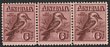1914 Kookaburra 6d reddish-maroon Engraved strip of 3. Superb fresh MUH. SG 19 cat £225 for M, should be at least double £450 MUH. ACSC 60B cat $825. (3) (P) |