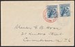 1928 Kookaburra 3d blue pr on plain cover, 1 with red FDI 29/10/28 Exhibition cds in red, other with green Exhibition cancel. VFU. SG 106a(var). ACSC 133 MS wa & ya cat $1000. (P) |