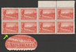 1936 South Australia Centenary 2d carmine Ash imprint blk of 4 with major variety 'retouch in sky above building (smoking chimney)' with normal Ash imprint for comparison. Variety blk fresh VF almost MUH, lightly hinged in margin. SG 161a cat £1250 = A$2500. ACSC 171zc cat $2750. Variety is very scarce. (8). (P) |