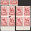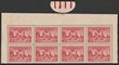 1936 South Australian Centenary 2d carmine top marginal blk of 8 with 4 lines (1111) in the top margin, believed to be some type of plate identification & not illustrated in the ACSC. Mostly F-VF MUH, few tones. SG 161(var). ACSC 171(var). Quite rare marking as only a few have been seen previously. (8). (P) |