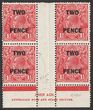TWO PENCE on 1½d Surcharge Ash imprint blk of 4 which shows 'sliced O in Surcharge' (3/4L60) so is either plate 3 or 4, this is not listed by ACSC. Fresh F MUH. SG 119(var). ACSC 101 (3) or (4) za cat $75 for M, should be at least double, $150 MUH. (4)