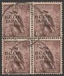 1946-47 BCOF Japan opt Kookaburra 6d purple-brown, se-tenant blk of 4, UR stamp variety 'narrow N'. Postally VFU, Army PO cds. ACSC J4/J4J cat $470+. SG J4/J4c cat £394+ as singles, plus premium for se-tenant blk which should be +50%, so est cat £590. 2025 Ceremuga AIEP photo cert. (P) |