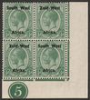 1923 setting I opt KGV ½d green, LR cnr marginal bilingual blk of 4 with plate no. 5, Litho opt in shiny ink. VF fresh MUH. Scott 1(var). SG 1d cat £26 for M prs, should be at least double £52 MUH plus premium for plate blk.