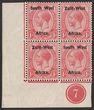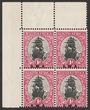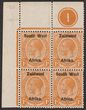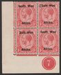 1930-31 'S.W.A.' opt Ship 1d black & carmine, UL cnr marginal bilingual blk of 4, Rotogravure printing. Stamps fresh MUH. Scott 106 cat US$30 for M. SG 69 cat £36 for M, should be at least double £72 MUH.