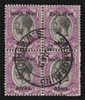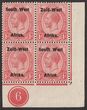 1923 setting I opt KGV 6d, se-tenant blk of 4 (2 prs), UL basic stamp variety white scratch through King's head'. VFU with 'Swakopmund 19 Jan 23' cds. SG 6+6(var) cat £100+, plus premium for variety (4) (P)