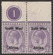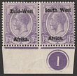 1923 setting I opt KGV 1/- orange-yellow, left marginal bilingual horiz pr, left stamp variety 'Wes for West with t mostly missing'. VF fresh MUH. Scott 7(var). SG 7(var) cat £19 for normal M, should be at least double £38 MUH. SACC 7a would cat R12,000+.